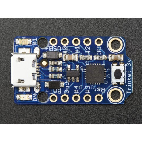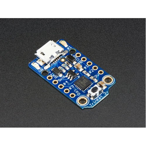 Trinket may be small, but do not be fooled by its size! It's a tiny microcontroller board, built around the Atmel ATtiny85, a little chip with a lot of power. We wanted to design a microcontroller board that was small enough to fit into any project, and low cost enough to use without hesitation. Perfect for when you don't want to give up your expensive dev-board and you aren't willing to take apart the project you worked so hard to design. It's our lowest-cost arduino-IDE programmable board!